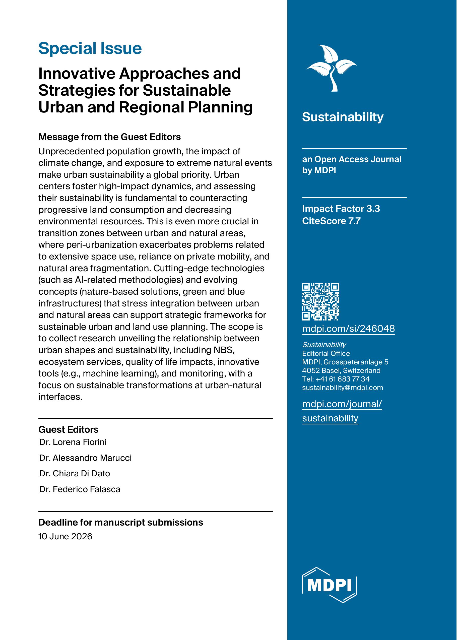 We are pleased to announce our participation as Guest Editors to the Special Issue “Innovative Approaches and Strategies for Sustainable Urban and Regional Planning”, Sustainability.